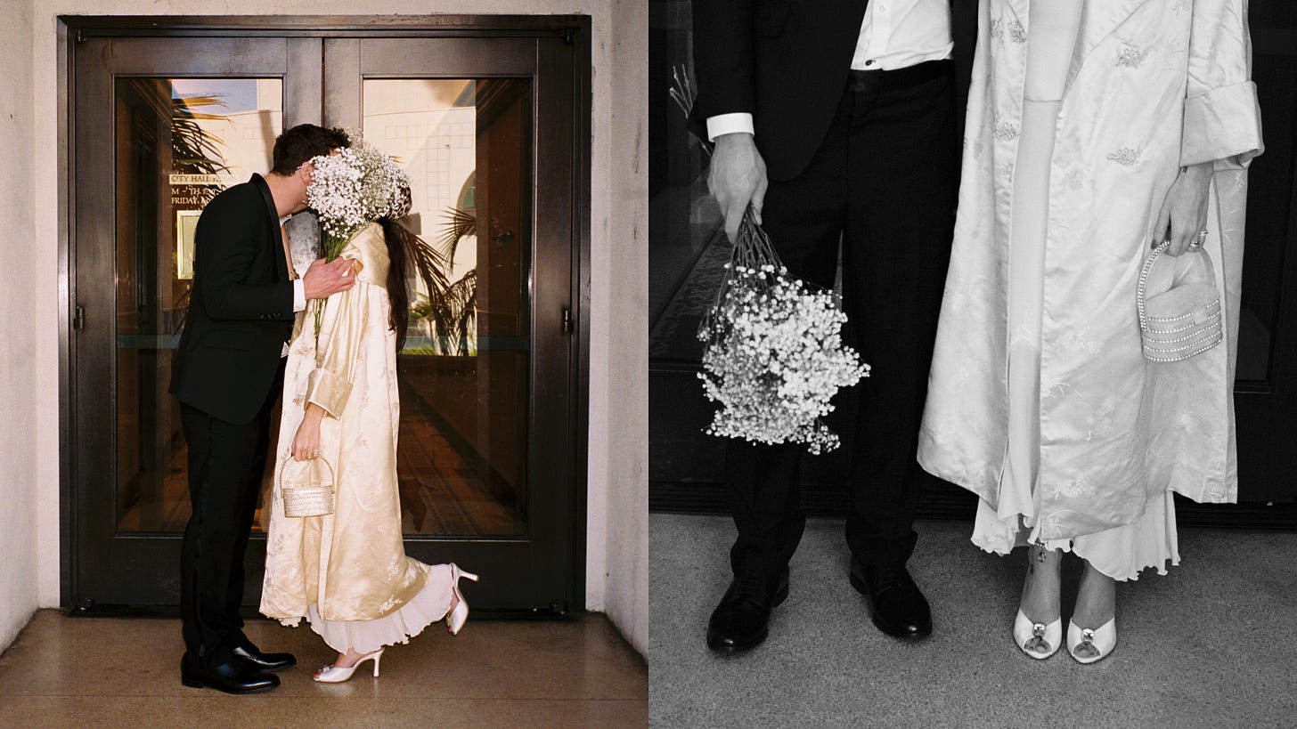 Late one afternoon at the Beverly Hills courthouse, the nou girl said “I do”. For the occasion, she air-dried her hair, chose her shoes before anything else, and picked a Tuesday because it was her second favorite day of the week. No orchestra, no aisle, no procession of chiffon. Just the afternoon light slipping between the city hall buildings and the hum of the world bustling around her.