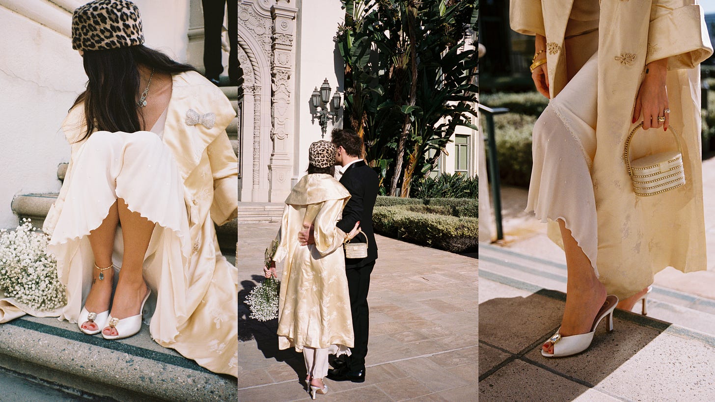I got fake married. Late one afternoon at the Beverly Hills courthouse, created a faux wedding moment to introduce nou’s debut bridal collection. The nou girl is the figure who lingers in my imagination when I design, and for this chapter, she is a bride. She air-dries her hair for the occasion, chooses her shoes before anything else, and never confuses tradition with obligation. Step into her world…