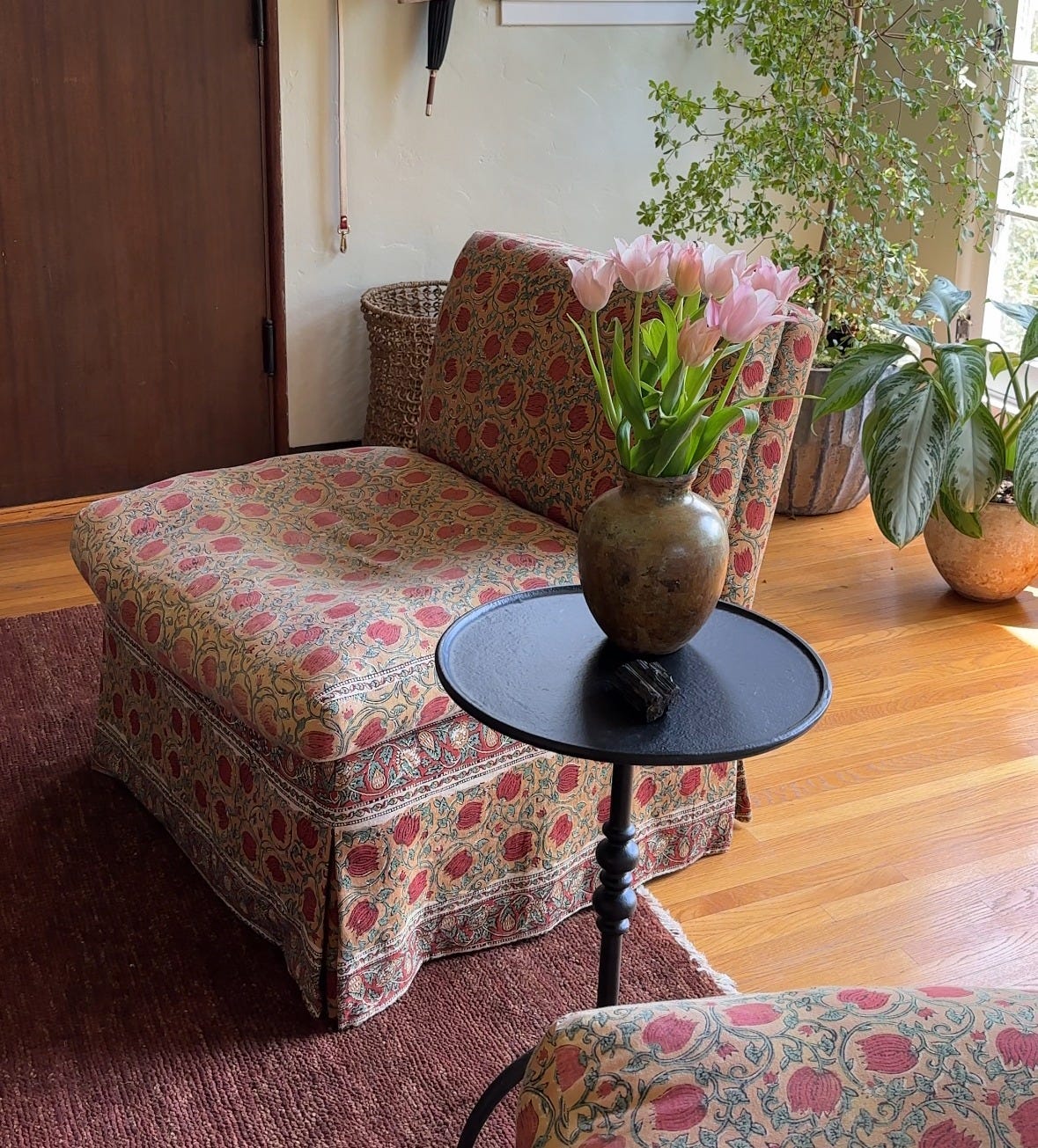 Metal Accent Table, Brass Vessel, Slipper Chair (Similar), Woven Rug