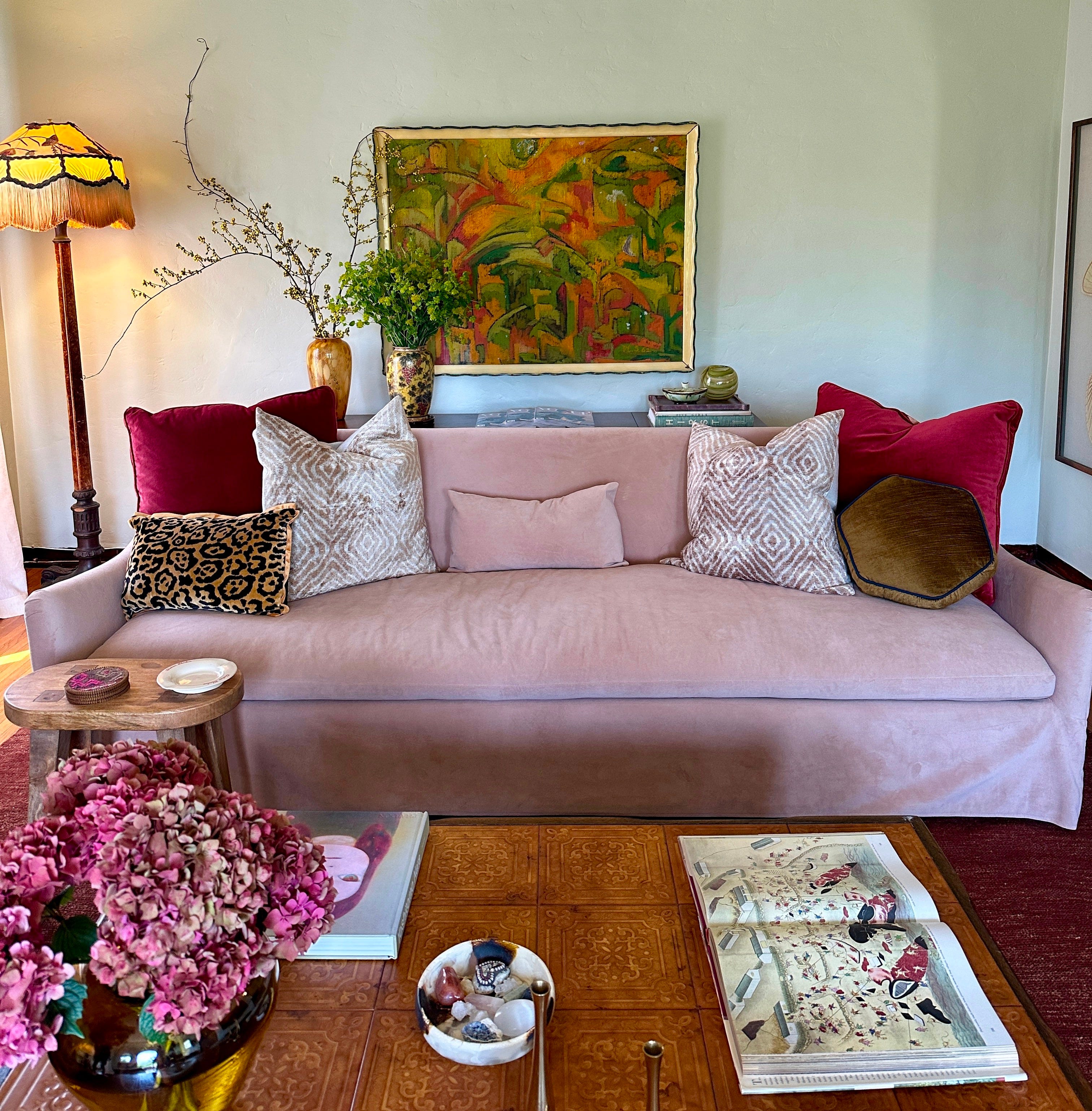 Blush Velvet Couch, Silk Pillow, Leopard Pillow, Large Pillow